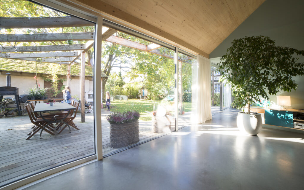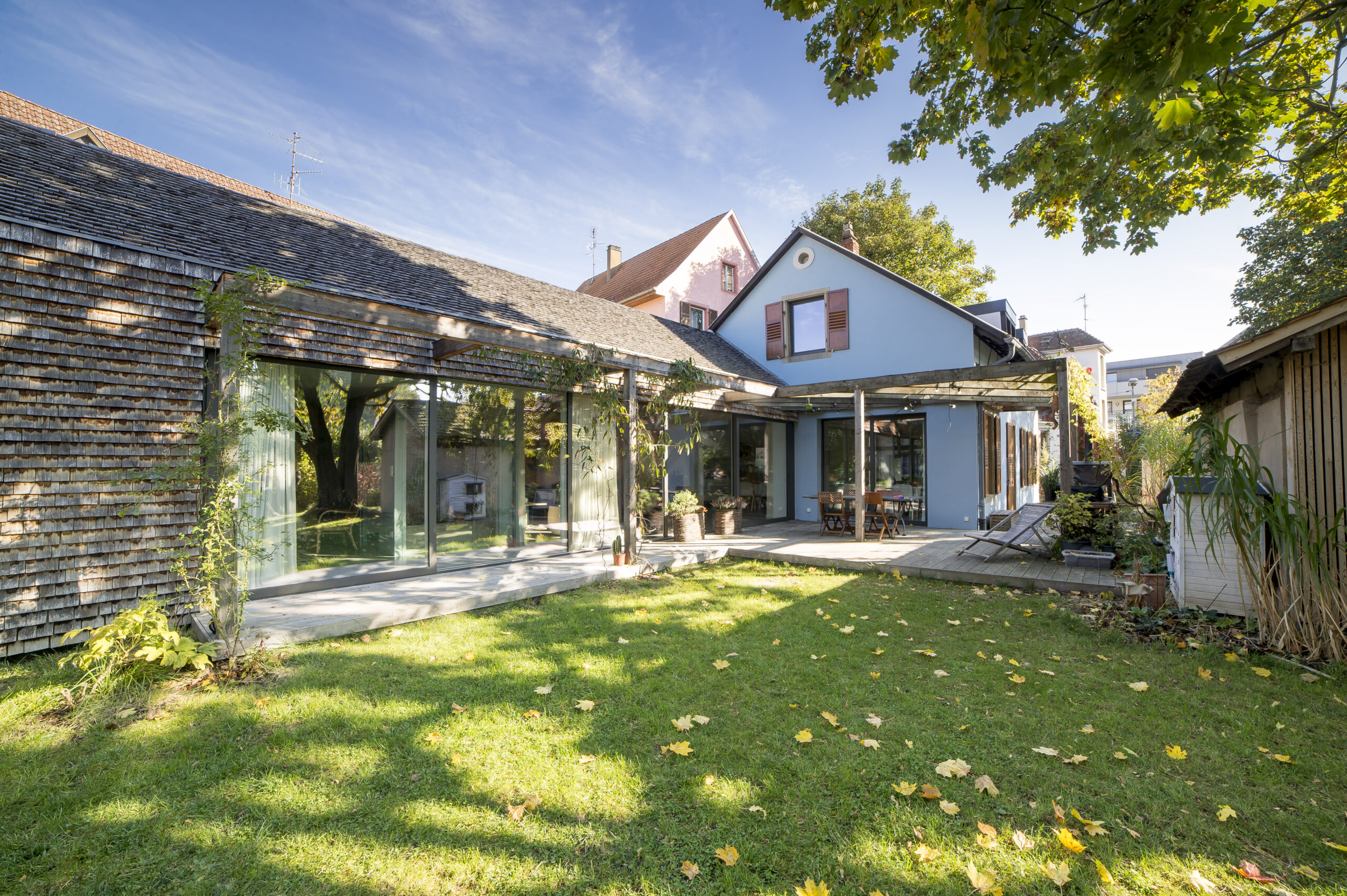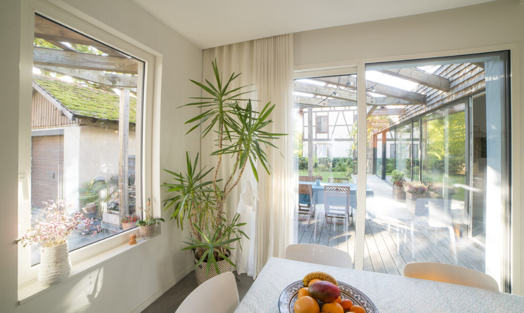 Réalisation de menuiseries pour une maison au style champêtre au coeur de Strasbourg. Pose de fenêtres, portes et baies coulissantes panoramiques adaptées à l’ambiance chaleureuse du projet. Confort, authenticité et efficacité énergétique au rendez-vous.