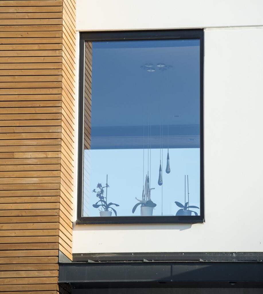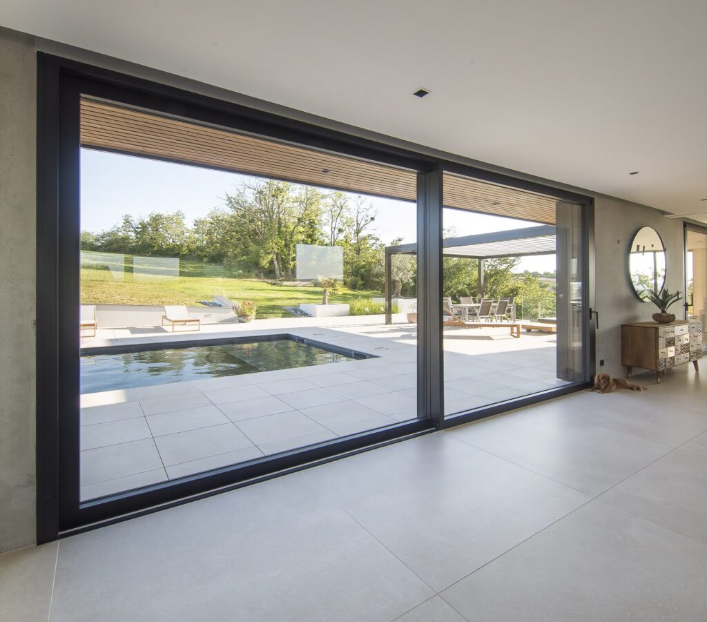 Construction d’une maison contemporaine à toit plat avec menuiseries sur mesure. Pose de grandes ouvertures coulissantes et fixes, portes et solutions d’occultation adaptées à l’architecture moderne. Optimisation de la lumière et du confort.